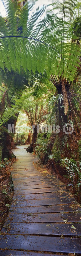 A small wooden pathway surrounded with green trees