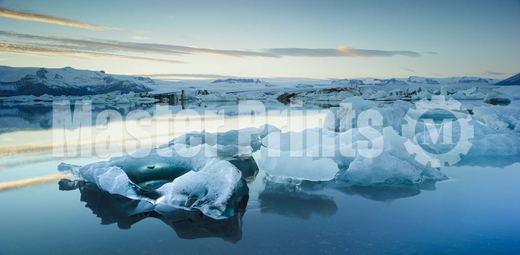 A panoramic view of glaciers in the water and the sky reflecting in it