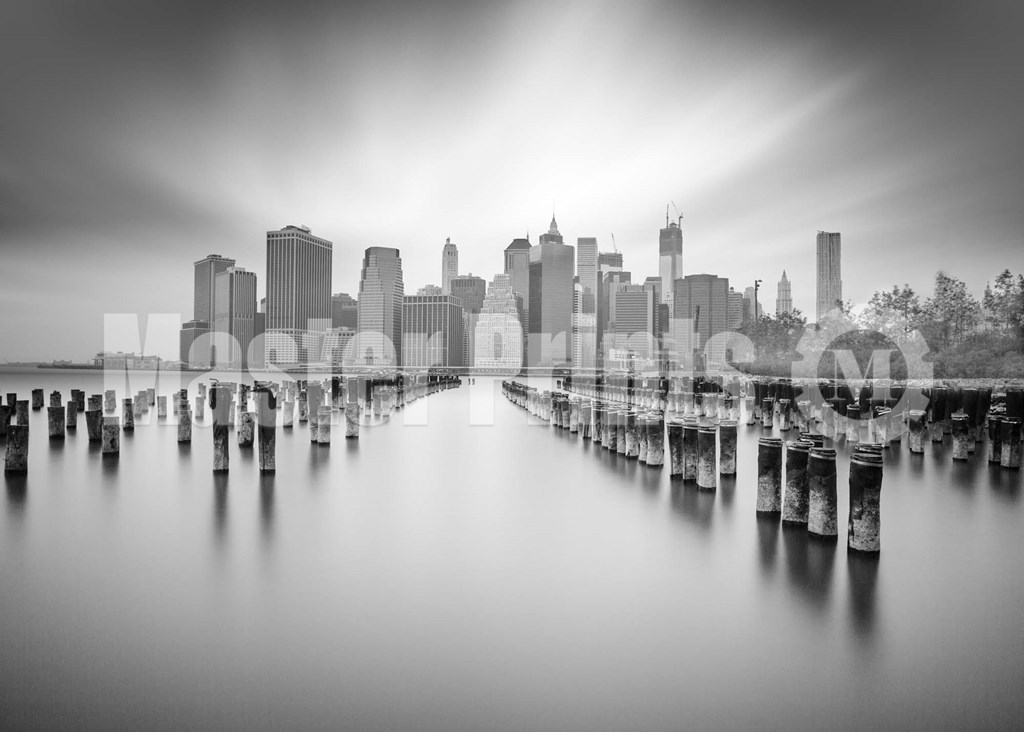 Down town Manhattan in the setting sun seen from ruins of old dockage in Brooklyn before September 11,2001