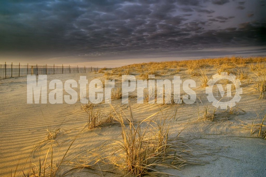 A sandy shore surrounded with grass and greenery with a fence in the distance at sunset