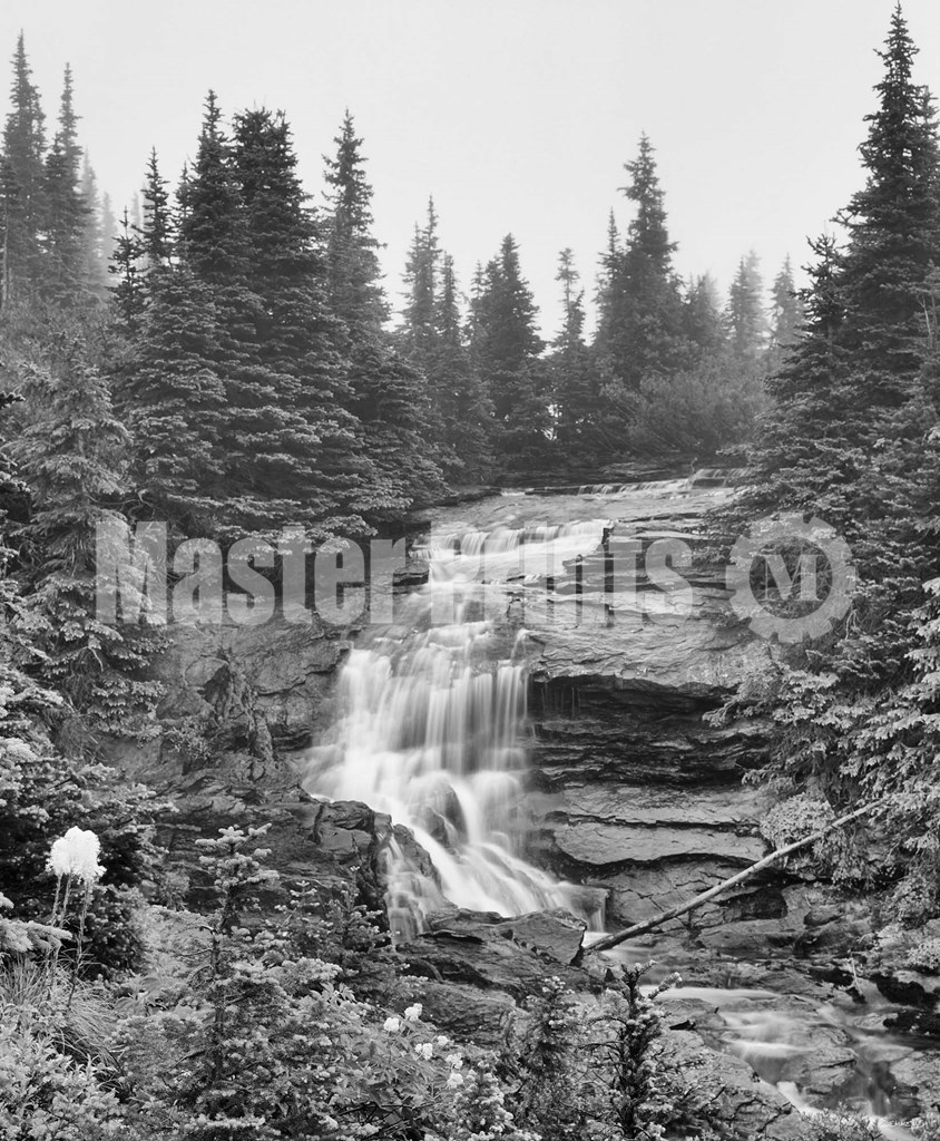Title: Waterfall Over Rock With Wildflowers