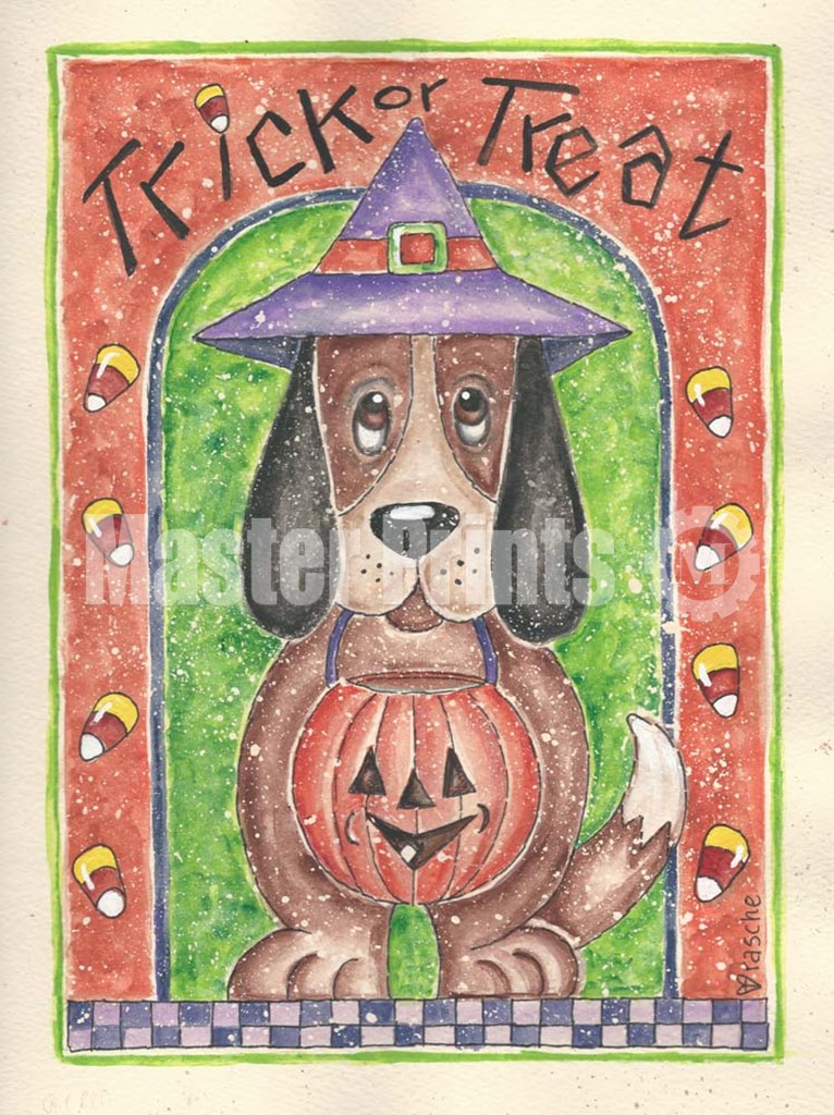 Trick or Treat Dog holding Pumpkin by Shelly Rasche art print