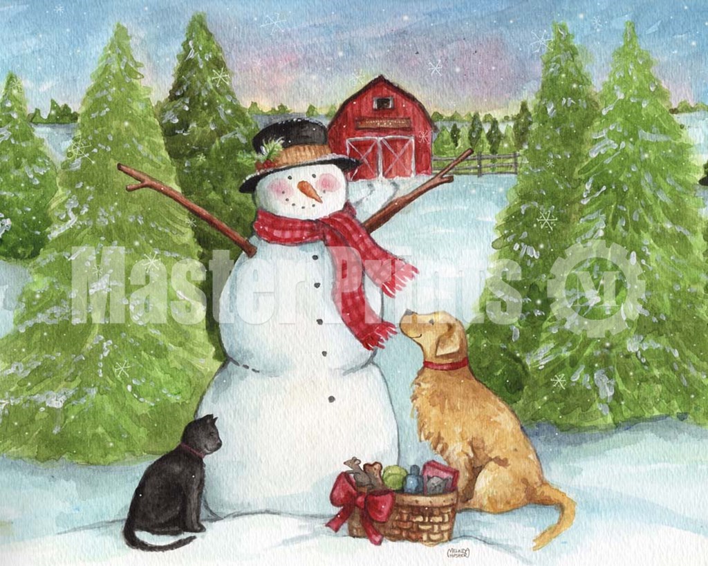 Melinda Hipsher Snowman Dog And Cat Farm Horizontal